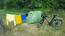 In der Nacht schon viel geregnet. Morgens alles im Zelt verpackt und das Zelt von innen nach außen während des Regens abgebaut. So konnte ich zumindest das meiste trocken verpacken. Das Außenzelt war natürlich triefend nass. Auf dem CP konnte ich aber unter Dach frühstücken. Danach ging es dann bei Regen los. Die ersten 30 km bis Hannoverisch Münden komplett im Regen gefahren. Dann wurde es trockener. Nachdem ich dann die Regensachen ausgezogen hatte ging es wieder los. Um so heftiger. Später dann immer hin und her mit den Regensachen, an, aus,... Insgesamt ca. 70 km im Regen. Auf dem CP Bootshaus in Beverungen wurde das Wetter dann besser. So gut, dass ich alle Sachen trocknen konnte. Ansonsten von der Tour nicht allzu viel mitbekommen, da ich nur auf den Regen konzentriert war.