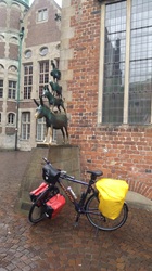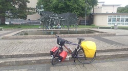 Die Fahrt dorthin über Bremen war bisher die schlimmste Etappe. Die ersten 20 km waren noch ganz gut. Der Wind relativ harmlos und bei starker Bewölkung aber trocken. Danach dann der Rest fast Dauerregen und sehr viel Wind, vor allem Gegenwind. Da peitscht einem der Regen so richtig ins Gesicht und man kommt kaum voran. Kurz vor Bremen versagten dann noch die vorderen Bremsen, die in den letzten Tagen schon seltsame klick Geräusche machten. Zum Glück konnte ein Fahrradladen mit Werkstatt die Bremsen spontan reparieren. Sehr nette Leute. In Bremen noch den kleinen Abstecher zu den Stadtmusikanten. Fotografieren war eine Herausforderung wegen des Regens. Das musste natürlich aber sein. Am CP angekommen, das triefnasse Zelt aufgebaut, und die Regenklamotten zum trocknen aufgehangen. Siehe da, es reißt etwas auf und die Sonne kommt mal durch.