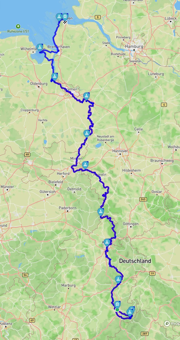 Nach 11 Tagen, plus einen Tag „Zwangspause“ wegen der Bahn, und rund 825 km, ist die Tour an Fulda und Weser zu Ende. Eine sehr abwechslungsreiche Tour, sowohl Strecke und Landschaft, als auch das Wetter. Leiter hat es etwas viel geregnet, und der fast stetige NWW Wind nervte etwas. Auf der gesamten Stecke konnte ich überall auf den CP’s oder den Kanuclubs spontan und einfach unterkommen. Die meisten CP’s waren auch mehr oder weniger auf Radfahrer eingestellt oder hatten zumindest eine Zeltwiese. Lediglich bei Cuxhaven wurde es etwas kniffelig. Hier ist man überhaupt nicht auf Radfahrer eingestellt. Ich hatte Glück, und konnte nach etlichen Telefonaten immerhin bei einem CP eine gerade noch freie ganze Parzelle belegen. Mein Rad hatte gut durchgehalten außer der kurzzeitigen kaputten vorderen Bremse keine weitere Panne.