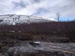Weiter ging es dann zum Nationalpark Absiko. In Abisko haben wir auf einem Parkplatz angehalten und von dort eine kleine Wanderung gemacht und anschließend im Wohnwagen gegessen. Da man auf diesem Parkplatz nicht mehr übernachten darf, sind wir dann weiter Richtung Norwegische Grenze gefahren und haben wenige Kilometer hinter Björkliden auf dem Rastplatz Tornehamn übernachtet. Immerhin gab es ein Trockenklo. Da in Absiko noch sehr viel Schnee lag konnten wir keine weitere großartige Wanderung machen. Am nächsten morgen sind wir nochmal zurück nach Absiko gefahren um noch eine Kurzwanderung zu machen. Danach sind wir nach Björkliden gefahren und sind noch zu einem Wasserfall gelaufen, den Silverfallet. Hier musste man teilweise etwas anders gehen, sonst wäre man wahrscheinlich im Schnee abgerutscht. Danach ging es weiter nach Narvik. Auf ca. halber Strecke zur Grenze haben wir an einem Rastplatz Mittagspause gemacht. Dieser Parkplatz war nur im ersten Teil geräumt, der Rest war noch mit Schnee bedeckt. In Riksgränsen (wörtlich heißt es Reichsgrenze), dem letzten schwedischen Ort vor der norwegischen Grenze haben wir uns nochmal mit Lebensmitteln eingedeckt. Dann ging es weiter nach Narvik zum Øyjord Camping. Wieder mal nur als Zwischenstopp für eine Nacht. Immerhin konnten wir am Nachmittag die Sonne genießen.