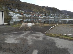 Von diesem Campingplatz aus sind wir dann nur mit dem Auto nach Hammerfest gefahren, ca. 50 Kilometer eine Strecke. In Hammerfest haben wir dann eine ca. 8 Kilometer Runde über den Salenhügel und durch den Ort gemacht. Das Wetter war wolkig, aber trocken. Unterwegs mitten im Ort sind wir dann einem Rentier begegnet. Die Zeit hat sogar gereicht um ein Foto zu machen. Auf dem Rückweg kurz noch eingekauft und dann zurück zum Campingplatz. Auf dem Rückweg war es dann schon wieder mal am regnen.